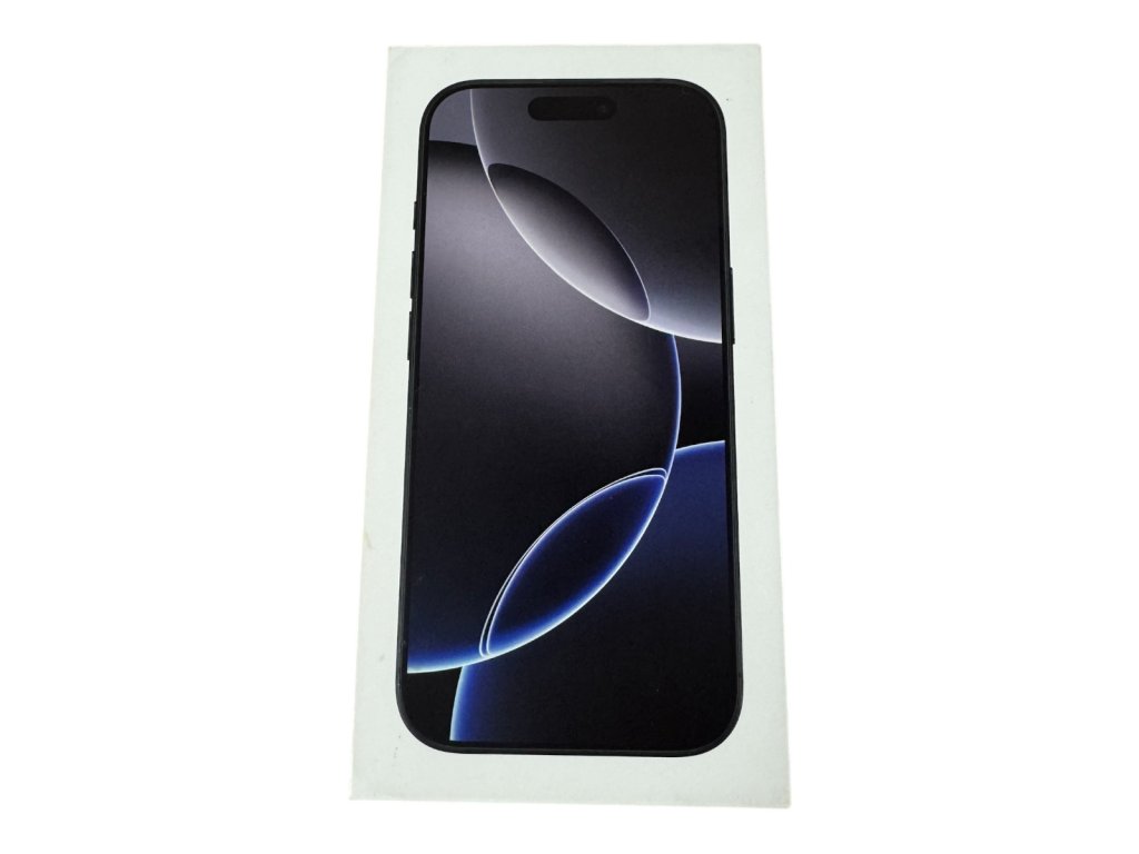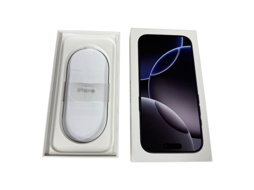 Náhradní krabička k iphonu 16 pro v barvě black s manuálem a jehličkou na sim.